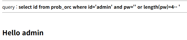 admin의 pw 길이만 파악하기 위해서는 ' or id='admin' and length(pw)>1-- 이런식으로 or 뒤에 id='admin' 구문을 넣어
