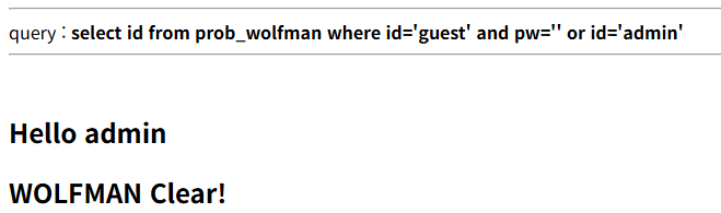 $query = "select id from prob_wolfman where id='guest' and pw='{$_GET[pw]}'";