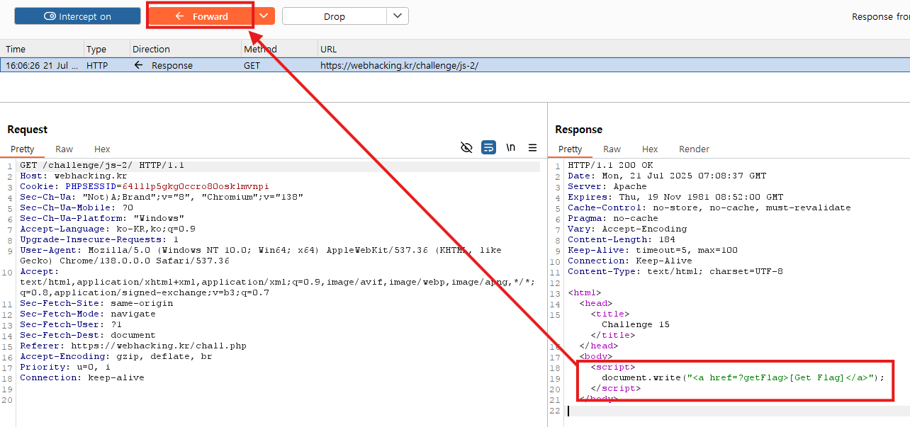 burp suite의 설정에서 response값을 인터셉트할 수 있는 설정을 켜고 문제 접속 과정을 확인해보면