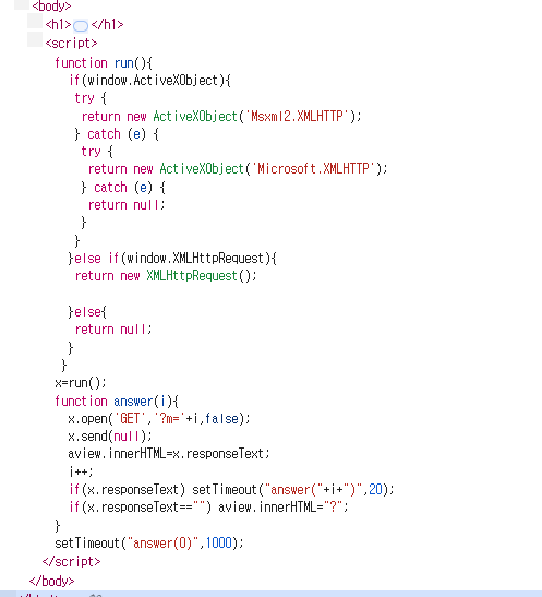 if(x.responseText=="") aview.innerHTML="?"; 코드는 플래그가 다 출력되고 기존에 작성된 문자열을 지우고 ?를 띄우기 때문에 출력된 flag를 사라지지 않게 하기 위해서는 해당 코드를 지우면 된다.