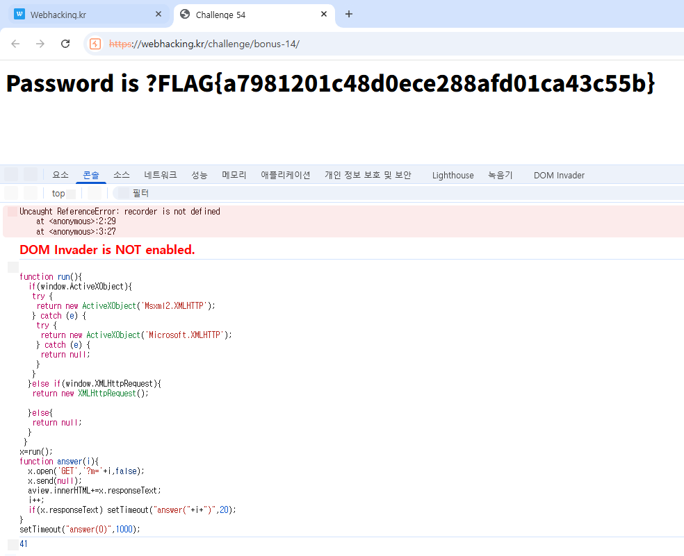 수정 후 콘솔창에 코드를 입력하면 flag가 출력된다.