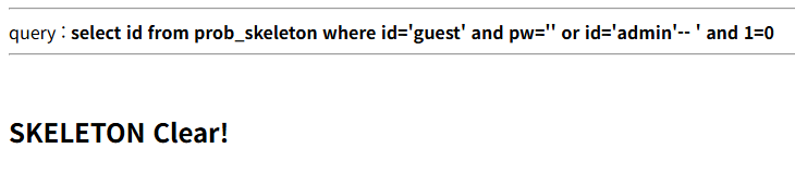 $query = "select id from prob_skeleton where id='guest' and pw='{$_GET[pw]}' and 1=0";