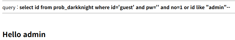 $query = "select pw from prob_darkknight where id='admin' and pw='{$_GET[pw]}'";