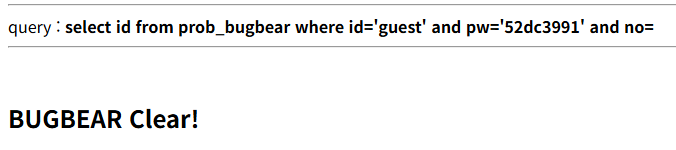 $query = "select id from prob_bugbear where id='guest' and pw='{$_GET[pw]}' and no={$_GET[no]}";
