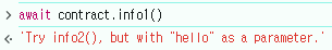 await contract.info1() 을 입력하니 이번에는 hello 파라미터를 넣은 info2() 를 입력하라고 한다.
