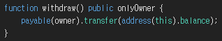 소유자 주소를 payable 타입으로 캐스팅하고 (ETH를 전송할 수 있는 주소로 바꾸고) 현재 컨트랙트가 보유한 전체 ETH 잔액을 소유자에게 전송한다.