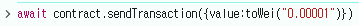컨트랙트의 contribute함수에 0.00001 이더를 wei로 변환하여 value로 트랜잭션을 보낸다.