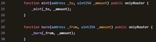 mint (발행)함수와 burn (소각)함수를 살펴보면 onlyRouter modifier로 보호되고 있다. 즉, router 주소로 지정된 컨트랙트만 mint, burn 함수를 호출할 수 있다.