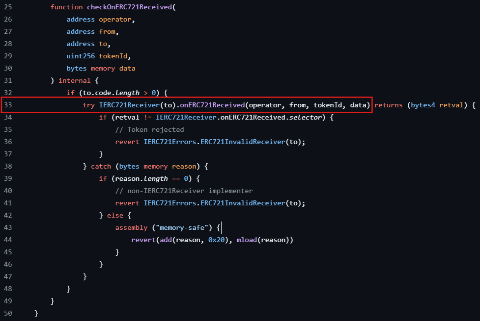 https://github.com/OpenZeppelin/openzeppelin-contracts/blob/master/contracts/token/ERC721/utils/ERC721Utils.sol#L25-L50