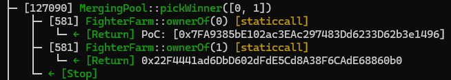 정상적인 로직으로 라운드 승리에 대한 보상을 진행받는다. 두 라운드를 진행하였고 두 번 다 승리를 하였기 때문에 tokenId 2, 3 두 번 보상이 지급된 로그를 확인할 수 있다. (공격이 가능한걸 검증하는 과정이기 때문에 일반 사용자가 보상받는 로그는 없음.)