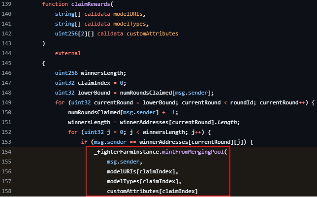 claimRewards 함수는 라운드별 승자에게 파이터(NFT)를 보상으로 지급하는 역할을 한다.