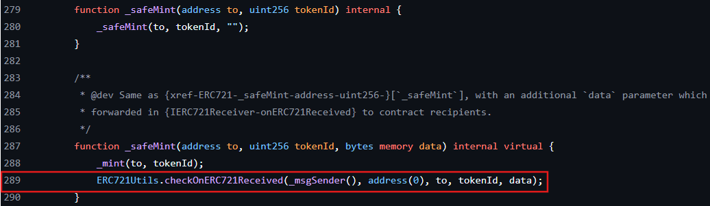 _safeMint 함수는 OpenZeppelin에서 제공하는데 코드를 살펴보면 279번줄의 _safeMint가 호출이 되고 이 함수내에서는 287번줄에 있는 _safeMint를 호출한다. 287번줄의 _safeMint에서는 ERC721Utils.checkOnERC721Received함수를 호출하는데