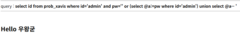 위와 같은 페이로드를 작성하면 @a변수에 id가 admin인 pw를 저장하고 해당 변수를 union select를 사용해 출력시키는 페이로드이다.