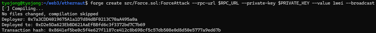 공격 컨트랙트를 배포하면서 --value 인자를 이용해 1wei를 공격 컨트랙트에 저장해 놓는다.