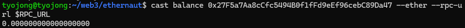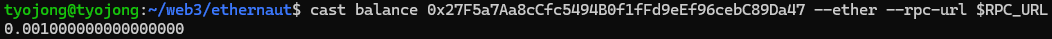 문제 컨트랙트의 이더를 cast balance 명령어를 이용해 확인해보면 0.001 ether가 들어있는 것을 알 수 있다.