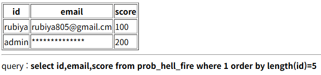 if(($result['email']) && ($result['email'] === $_GET['email'])) solve("hell_fire");